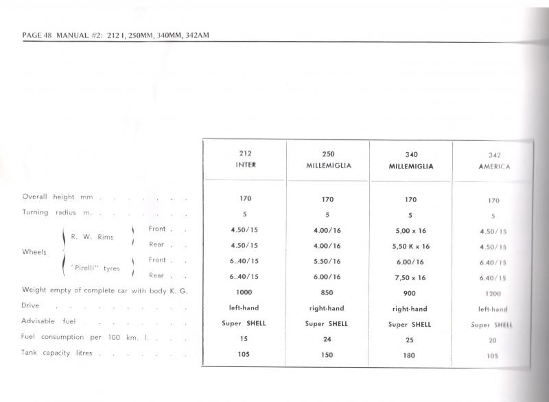 - To corroborate this the image below shows the original Ferrari manual for cars such as the 212, 250, 340 & 342 which states that the Ferrari 342 would fit PIRELLI tyres in the size 6.40x15, which would today be the 185 VR 15 PIRELLI CINTURATO CA67.