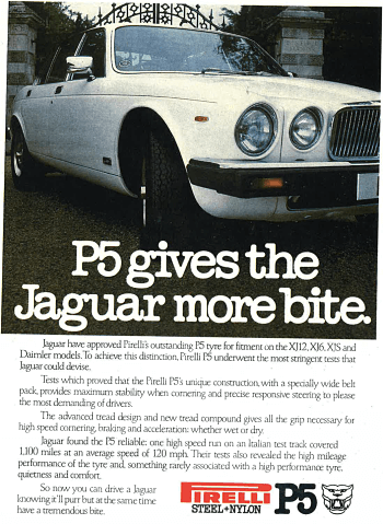 In 1977 Jaguar asked Pirelli to help them have the, consistently best tyre possible for their XJ6, XJ12 and XJS luxury cars. Through the Jaguar community we have had the following words from one of the Jaguar engineers of the time who was involved in the testing of the Pirelli P5 on the Jaguar XJ12 in September 1978. The Pirelli P5 was homologated by Jaguar in 1979 for these cars and then later for the Jaguar XJ40.